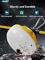 Specification - 50FT total length, 5 LED Bulbs Included, Totally 50 Watts, 5000 Lumen,5000K Color Temperature, Input 110-130 Volts AC, IP65 Waterproof, IK10 Anti-collision, ETL Certification. Super Bright & Energy Saving - The LED construction light is designed with high quality LED chips which is super bright. And it's energy saving which can save your electric charge up to 80%. Quick & Easy Installation - Each lamp head of the led construction string lights is equipped with a magnetic hook and carabiner hook. This is very suitable in applications where iron materials are used, such as storage racks, outdoor canopy, shelf brackets, etc. Linkable & Portable - The temporary string lights are extendable and flexible, seamlessly connect up to 12 sets(60bulbs). Ideal for barn, attics, garages, courtyard, worksite, workshop, factory, warehouse, unfinished construction and jobsites where temporary lighting is needed for a wide area. Industrial Grade - IP65 waterproof rating and IK07 protection rating mean this work light can meet the needs of indoor and outdoor professiona use. Whether it is high temperature or severe cold, it does not affect its performance. Quatily Assurance - Our string work lights have a lifespan of 50000H. We employ the long-lasting insulation material and uphold the highest standards for all our products by testing each product for optimal performance and safety, just buy with confidence.