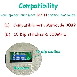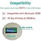 - *Compatible with multicode garage gate door opener remote transmitter multi-code 300 MHz, 10 digit remote control gate opener switch【NOT UNIVERSAL REMOTE】. *Works for 300MHZ Multi-Code 3089 308911 MCS308911,3060 MCS306010,3070 MCS307010 ,generic multicode garage gate door opener remote Control transmitter,10 dip switch.