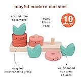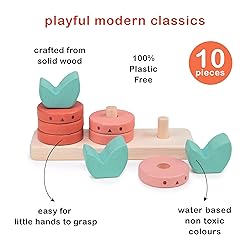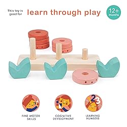 VEGETABLE THEMED STACKER - A fun themed Montessori toy designed to captivate young minds aged 12 months and up. This educational counting and stacking toy is perfect for little ones eager to learn while having fun. Counting Vegetables features a sturdy natural wood base with 3 pegs of varying lengths, allowing children to stack 6 colored disks and 3 green leaf toppers to create vegetables of different heights. STACK, COUNT AND PLAY - Where will your little one place the disk with the smiley face? Counting Vegetables is a versatile toy that fosters early learning and development in children. It promotes numeracy skills by teaching counting through stacking vibrant disks, enhancing fine motor skills and problem-solving abilities. Additionally, the theme and green leaf toppers stimulate imagination and creative play, making learning enjoyable and interactive. GROW AND LEARN - Crafted from sustainable rubber wood and colored with non-toxic water-stain paint, Counting Vegetables is built to withstand enthusiastic play while offering hours of safe educational fun. The toy comes with a sturdy base with 3 pegs, 6 colored rings and 3 green leaves for stacking and ‘growing’ the vegetables. Dimensions of 6.89 x 2.17 x 3.54 inches. GENTLE ON THE EARTH AND YOUR CHILD - Our products are made with love, learning, and sustainability in mind. Made from rubber tree wood, a by-product of the latex industry, and painted with non-toxic water-based paints and stains, our toys are earth-friendly and safe. For every tree used to create a beautiful toy, another is replanted, ensuring a greener future. SAFETY STANDARDS, CRAFTMANSHIP AND QUALITY - Our toys are not only fun but also built to last, adhering to high safety standards including EN71, ASTM, and AS/NZS ISO. Designed in Britain and crafted in Indonesia by our good friends, they promise durability and safety for your little ones.