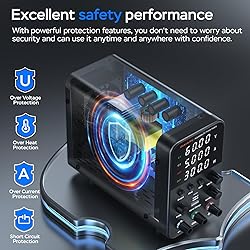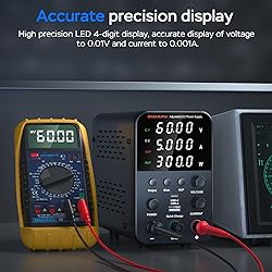 【High Precision Encoder Knob】Unlike ordinary potentiometer knobs, this DC power supply is equipped with a high precision encoder knob that has strong accuracy and stability. Pressing the knob to change the digits to the left, and rotating the knob to adjust the set voltage or current for each digit between 0-9. Make work more convenient and flexible! 【Output Switch Control】When using the DC power supply in experiments or work, the output button can prevent you from forgetting to turn off the output and causing damage to the load. Press the output button to turn on or off the output of the power supply. The status can be seen in the indicator light on the left side of the display, making it easier for you to use the bench power supply. 【Overcurrent Protection】The adjustable power supply has an OCP switch button, which allows you to select whether to turn on or off the OCP according to your work needs. When the OCP function is enabled, if the load device is short-circuited during operation, the adjustable power supply will automatically stop output and emit a buzzer to remind the user. Protect adjustable DC power supplies and loads from damage. 【4-Digit Display Screen】Variable power supply has 0-60V 0-5A high-definition display screen, which can simultaneously display three values of voltage, current, and automatically calculated power. It has constant voltage (C.V.) and constant current (C.C.) modes, which can be automatically switched. The indicator light of the working status can be seen on the display screen. The data is accurate to 0.01V and 0.001A. The high-definition digital display helps you operate as usual in the dark. 【Excellent After-sales Service】Providing high-quality products is our major commitment to our customers, and each product has been repeatedly tested. If you encounter any problems with the product you receive, you can always contact us. DIAIARY Benchtop Power Supply provides a 1-year warranty plan and online technical support.