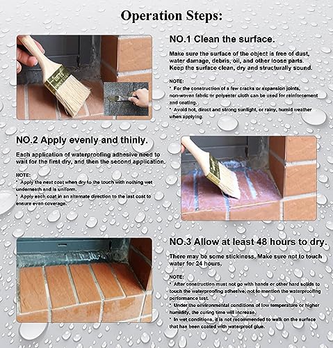 - Transparent Waterproof Glue Is Easy To Use: Mix the invisible waterproof glue well before use. Brush, roll, wipe, dip or pour, you can use the brush to dip and wipe, roller to apply, pour and then apply. The liquid waterproof sealant is applied evenly, and the self-leveling formula can smoothly cover and penetrate small gaps and cracks, and play a sealing role. Water-based waterproof sealant is suitable for both indoor and outdoor use.