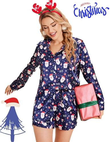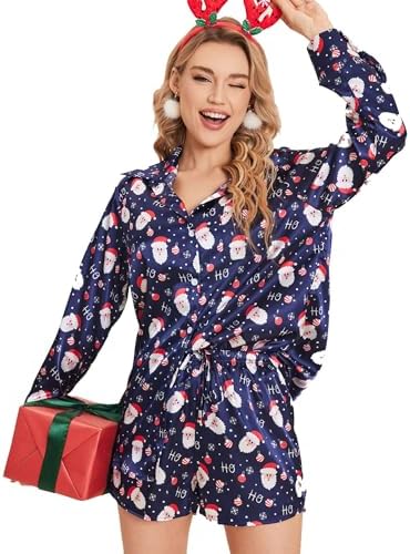 Ekouaer Womens 2 Piece Satin Pajama Set Long Sleeve Lounge Sets Button Down Tops and Shorts PJs Soft Sleepwear Set Blue Snowman L