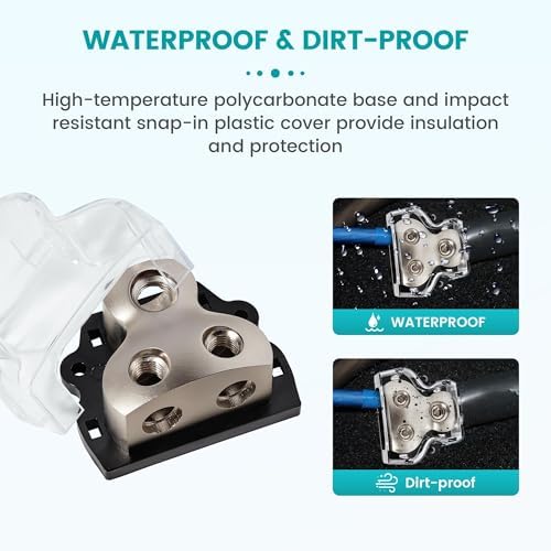 - High Quality: 2 way car audio power distribution block made of zinc alloy material for good conductivity and superior corrosion resistance; High-temperature polycarbonate base and impact resistant snap-in plastic cover provide insulation and protection