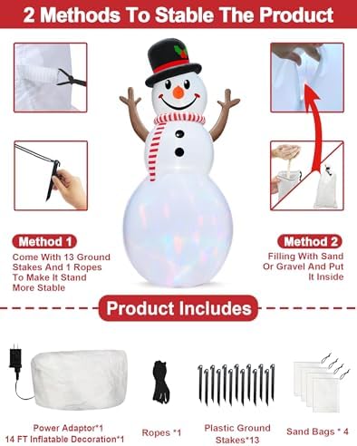 - Firmly Fixed On the Ground: Includes a 14 Ft Tall inflatable, 13 plastic ground stakes, 4 sand bags, 1black rops, 1 plug and built-in fan; Fill the sand bags with sand and put them into inflatable, stakes and tethers will firmly fix the inflatable on the ground and keep it stable