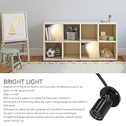 EASY TO INSTALL: Mini LED spot light comes with a screw fitting kit, easy to complete the fixed open installation, easy to install. APPLICABLE PLACES: Dimmable LED spotlight is suitable for display cabinets, jewelry cabinets, cabinets, entryways, tables, shelves, etc. BRIGHT LIGHT: Mini spot lights have stepless dimming switch button, luminous color temperature is pure, no glare, no light, eye . COMPACT DESIGN: Mini spotlight is compact, does not take up space, will not affect the overall beauty of the wall, so that the interior decoration is more simple. WITH CABLE: Dimmable spot light comes with a 6.6 feet long wire, the cable is long enough to meet different DIY needs.