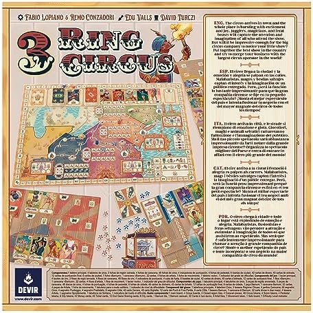 Diseñador: Paddle Conzadori y Fabio Lopiano. Y arte: Edu Valls El circo ha llegado a la ciudad. ¡Debajo de la carpa, los malabaristas, payasos, magos, hombres fuertes y bestias cautivan la curiosidad de una audiencia dedicada que aplaude sin cesar. Después de cada actuación, tu pequeña compañía acumula fama y puede un día despertar el interés de P.T. Barnum, el mayor magnate del circo de todos los tiempos. En 3 Ring Circus, los jugadores toman el papel de un director de circo viajando por Estados Unidos a finales del siglo XIX. Su objetivo es contratar artistas y ofrecer actuaciones en varias ciudades con la intención de ganar fama. En las ciudades, las características son fáciles de establecer y proporcionan funciones iniciales para actualizar tu elenco; los pueblos pequeños son un poco más exigentes pero permiten el contacto con los mejores artistas; las audiencias de las grandes ciudades son aún más exigentes y quieren ver números muy específicos, ¡pero actuar allí te trae mucho más fama!