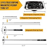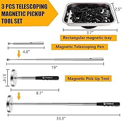 PRODUCT MATERIAL & CONSTRUCTION:Crafted with a non-slip rubber ergonomic grip, this magnetic pickup tool ensures comfortable and secure handling during extended use. The chrome-plated iron base offers enhanced sturdiness and corrosion resistance, while the set includes a large magnetic pickup tool, a compact magnetic pickup pen, and a rust-proof magnetic tray for versatile applications. EXTENDABLE HANDLE & PORTABLE DESIGN:Featuring a telescopic magnet pickup pen, the tool smoothly extends from 4.6" to 19", allowing easy access to confined or hard-to-reach areas. When retracted to its compact 4.6" form, it stores neatly in toolboxes, pockets, or tight workspace slots, supporting an organized and clutter-free environment. POWERFUL MAGNETIC PERFORMANCE & EASE OF USE:Equipped with a full-body strong magnet, the tool efficiently collects nails, screws, bolts, and various ferrous debris with minimal effort. The extendable handle reaches up to 33.3", making it suitable for sweeping across floors, lawns, or garage spaces, while the ergonomic grip ensures user comfort during operation. VERSATILE APPLICATION & SAFETY ASSURANCE:Ideal for post-project cleanup in workshops, after roofing tasks, automotive repairs, or DIY activities, this magnetic sweeper helps safely remove hazardous metal scraps from floors, grass, driveways, and other surfaces—effectively reducing the risk of punctures or injuries. THOUGHTFUL GIFT FOR PRACTICAL USERS:Designed with user-friendly features, this premium magnetic tool set serves as a thoughtful and practical gift—especially for parents, seniors, or anyone who finds bending down challenging. Perfect for special occasions such as Christmas, Father’s Day, Thanksgiving, or birthdays.