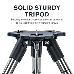 Solid, sturdy tripod exclusively for the StarSense Explorer Tabletop Dobsonian SECURE ATTACHMENT: Lock your Dobsonian base and telescope to the tripod with three captured screws ADJUSTABLE HEIGHT: Customize your setup so the telescope is at the most comfortable height for everyone in your group BUILT-IN ACCESSORY TRAY: Stay organized and keep your eyepieces close at hand COMPACT & PORTABLE: Tripod legs collapse for easy transport to and from your observing site UNBEATABLE WARRANTY & CUSTOMER SUPPORT: Buy with confidence from Celestron, a leading optics brand in California since 1960. Your purchase includes a Celestron Limited Lifetime US Warranty & US-based expert tech support