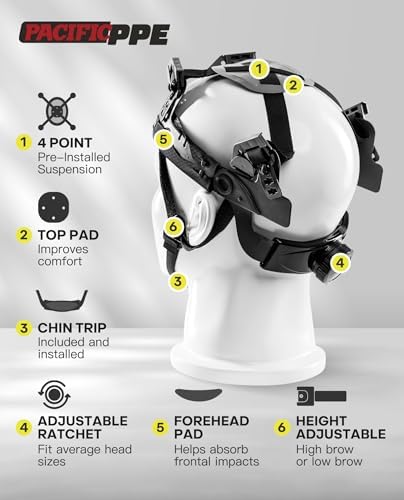 - 𝐒afe & 𝐂omfortable: 4-point adjustable suspension system reduces impact effects while enhancing safety. Equipped with a chinstrap and a one-hand operable ratchet suspension system, the helmet stays securely in place and is easy to remove, delivering both protection and comfort for your workday.