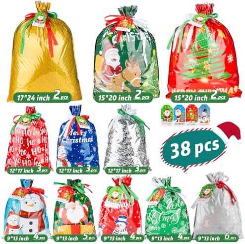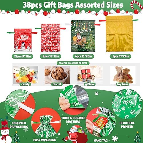 RBONIGHT 38PCS Christmas Drawstring Gift Bags of Assorted Sizes Small Medium Large Jumbo, Holiday Bags with Colorful Drawstrings for Xmas Party Favors,Christmas Presents
