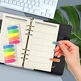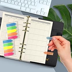 Included in the package: 2 packs of monthly plan insert paper, 1 receipt pouch, 1 4-pocket card bag, 1 pack of colorful 5-sheet paper dividers, 1 A6 Today bookmark ruler with inch units, and 200 colorful index stickers. Mind size before purchasing: appr. 6.73 x 3.70''=17.1x9.4 cm. The paper is of premium quality, thick, impurity-free, smooth, and wear-resistant. Suitable for writing, ideal for 6-ring A6 binders, planners, day runners, journals, and notebooks. When open flat, Monday starts on left. High-quality binder pockets measure 6.80 x 4.20 " and fit A6 binders. Crafted from PVC material, these pockets are waterproof, durable, and allow you to organize pens, bills, money, vouchers, credit cards, and small office supplies without the need for hole punching. Clear view for easy identification and a great addition to A6 binders. The translucent Today bookmark ruler serves as an easy page finder for daily use, eliminating the need for endless page flipping to find your spot. It also doubles as a handy ruler with centimeter and inch units. Approximate dimensions are 4*18cm, making it a perfect fit for your A6 Size 6-Hole organizer. Enjoy colorful index stickers and taped index paper dividers in this package. Includes 2 packs of 100 fluorescent stickers, arrow-shaped with 5 color options, made from premium PET, perfect as page markers, bookmarks, and reading tags to highlight important contents. The dividers are made of durable and smooth 250gr premium paper, suitable for writing and drawing. Eye-catching and easy to find reference information, works well with the provided stickers.