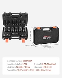 - Specifications Item Model Number: SS217809A Impact Sockets Set: 9 Pieces Material: Cr-Mo Alloy Steel Hardness: HRC42-48 Product Size: 13.11 x 8.46 x 2.76in / 333 x 215 x 70 mm Net Weight: 11.02 lbs / 5.0 kg Deep Sockets: 29 mm, 30 mm, 31 mm, 32 mm, 33 mm, 34 mm, 35 mm, 36 mm, 38 mm. Package Content 9 x Deep Sockets 1 x Toolbox 1 x User Manual