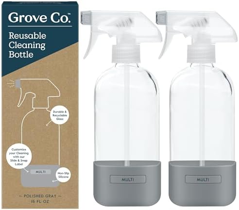 - REUSABLE GLASS SPRAY BOTTLE SET: Customize your cleaning routine with these Grove Co. glass spray bottles with silicone sleeve. The Slide & Snap feature allows you to label the cleaning solution content - floor, glass, multi-surface or tile & tub