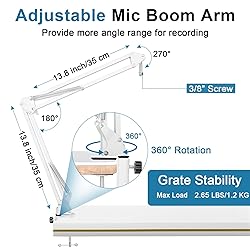 【Professional White Mic Boom Arm】This white microphone stand is specially designed for hyperx quadcast S microphone, with a pop filter,mic foam cover, and converter adapter. High-quality steel material with super-strong springs ensures an excellent load-bearing capacity of 2.65 lbs/1.2kg, keeping your mic properly balanced without sinking, shaking or making noise. Suitable for a variety of applications, including gaming, singing, studio recording, broadcasting, and family performances. 【Adjustable Microphone Stand】This premium white boom arm offers full adjustability in all aspects, including a 360° base rotation for a 135° back and forth extension, a 180° arm shaft for up-and-down movement, and a 270° metal adapter to freely positioning microphones. You can easily adjust the mic to the desired angle, allowing you to showcase voice perfectly. And it's easy to setup and folding. The supplied 3 cable sleeves will organize your mic power cord,ensure the cord doesn't get tangled. 【Upgrade I-Shape Table Clamp】 Unlike other stands that are made of plastic and have easy-to-slide pads that are damaging your table,our ChromLives upgraded desk clamp is made of metal, equipped with securely fitted padding on top and the middle. It is effectively protects your tabletop from scratches. And the padded clamp thickness up to 1.77 inch/45mm, suitable for most table and desks. 【Perfect Mic Covers & Pop Filter】 QuadCast windscreen cover made of high density foam, it effectively reduce breath, wind noise and other unwanted background noise to improve the audio quality. Pop filter for hyperx mic with double layer mesh, it can block air blasts and pops when recording vocals and ensure ensuring your voice won't be stifled or muffled. These microphone accessories wolud keeps your hyperx quadcast s microphone safe from harmful, dust and moisture. 【All-in-One Combo】Package includes 1* white hypex quadcast boom arm; 1* I-shape Clip; 1* Pop Filter; 1* Microphone Foam Cover; 3* Cable Sleeves (White); 1* 3/8” to 5/8” Screw. (Note: Hyperx Quadcast S Mic is Not Included! )
