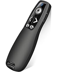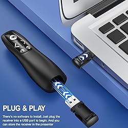 - Wireless presentation Features Fully functional and super easy to use Bright Red light to catch your audience’s eyes Long wireless control range,you can move with your heart Possessing both salient point design and non-slip design Specifications - Wireless Presenter Remote Material: ABS Light Color: Green Radio Frequency: 2.4GHz Light Distance: > 100m Battery: 2 x AAA Battery (Not Included) Dimension: 5.31x1.65x0.95inch Control Distance: 15m-20m (The effective distance will change with the surroundings) USB Receiver Supported OS: Win 2000, XP, Vista, Win7, Win8, Win10, MAC OS, Linux Package Includes 1 x Wireless Presenter remote 1 x USB Receiver 1 x User Manual