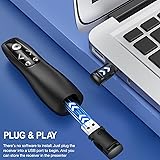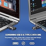 【AIR MOUSE PRESENTATION CLICKER】 PowerPoint presenter combines the function of air mouse and normal clicker, with a wireless cursor control button and left mouse button, which makes it like a true mouse. With it in your hand, you can be totally smooth from the constraint of the keyboard and make your presentation more efficient 【2-IN-1 USB Type C PRESENTATION CLICKER】The presenter clicker comes with a unique dual-head design, USB & TYPE-C can meet all your need. You can smoothly switch between different port devices such as Mac, laoptop and pc, one for multiple computers. At the bottom of the slide clicker there is a magnet which can hold your USB dongle securely. (Powered by 2pcs AAA Battery are not included) 【BRIGHT RED LIGHT】Wireless clicker for PowerPoint presentations, which is stronger than red light. It’s easy to see against in the most any background, can be used to highlight key parts of a presentation, then you can be sure they won't miss the point 【EASY TO USE】Plug the 2.4 GHz receiver into your computer's USB port and you're ready to start the show. You needn't have to set up anything and no software to install. The clicker for powerpoint presentation is suitable for all ages, when your presentation is over, simply store the receiver inside the presenter 【LONG CONTROL RANGE OF THE CLICKER】With this pointer presenter remote, you can come out from behind the computer or podium and connect with your audience smoothly. The powerpoint clicker also has a wireless control range of up to 100 feet, so you can make your lectures more interactive rather than just talking to your students from standing at your desk clicking buttons