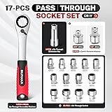 BILITOOLS 17PCS 3/8" & 1/2 Pass Through Socket Set, 2-In-1 Conversion For Standard Ratchet/Pass-Through Ratchet, Pass Thru Go Through Mechanics Tools Set For Hex, Square, E-Torx, Spline