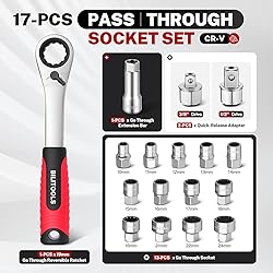 【Pass Through Design For Long Bolts】This pass through socket set is ideal for tightening and loosening nuts on threaded rods that deep sockets can’t access. The hollow sockets and pass through ratchet heads allow threaded rods to pass through the tool, providing quick access to fasteners and eliminating the need for deep sockets 【2-in-1 Ratchet Modes】 This 19mm wrench converts between a standard ratchet (using 3/8" or 1/2" drive adapters) and a pass-through wrench (for spline sockets) 【SAE / Metric Spline Socket】Crafted from tough chrome vanadium steel, these spline sockets (available in 10, 11, 12, 13, 14, 15, 16, 17, 18, 19, 21, 22, 24mm) are engineered for use with various fasteners including star, square, hex, spline, and even some rounded shapes 【19mm Reversible Ratchet Wrench】This wrench features a 72-tooth gear for smooth ratcheting in a 5° arc. The low-profile design provides easy access to tight spaces, and the direction switch provides instant drive reversal 【Organized & On-The-Go】Our pass thru socket set comes with a sturdy, portable storage case that has size markings inside for perfect organization—no more mess. Trust me, it's a fantastic choice whether for your own use or as a gift for parents, your partner, or friends