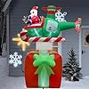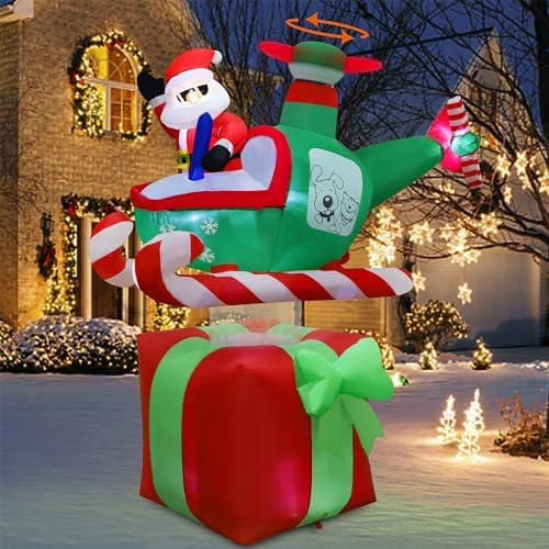 - Christmas Inflatable Decorations: Our 6 feet tall Xmas inflatable outdoor decor portrays Santa Claus piloting a helicopter with spinning propeller, landing on a large, red gift box, making for an amusing and memorable holiday scene. It adds an eye-catching centerpiece to your holiday seasonal layout and makes it big and attractive Christmas decorations around. With led lights inside, light up at night and make your home a new sight in your neighborhood