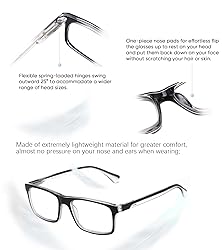 ⭐WORKSPACE MULTI FOCUS GLASSES: Designed to provide great visual clarity and comfort for people who spend long hours in front of computer monitors/screens, desks, or other spaces approx 3ft. The top part of the lens is HALF the magnification you select, which is for daily communication/interaction. The middle part is slightly reduced transition strength for PC/Laptop work. The bottom is the normal power you choose for reading/writing, etc. ⭐EXTREMELY LIGHTWEIGHT MATERIAL: ①Made of extremely lightweight material for greater comfort, almost no pressure on your nose and ears when wearing; ②Flexible spring-loaded hinges swing outward 25° to accommodate a wider range of head sizes. ③One-piece nose pads for effortless flip the glasses up to rest on your head and put them back down on your face without scratching your hair or skin. ⭐HIGH TRANSMITTANCE & ANTI-BLUE LIGHT: High transmittance polycarbonate lens, clearer and more durable than normal plastic lens; Features blu-ray blocking coatings which can effectively filter harmful blue light and radiation, relieve eye fatigue/dryness when using phones, computers, or tablets, and indirectly improve sleep quality. ⭐CONVENIENCE: Keep one at home and one in the office, or share with a family member. Come with 2 matched leather eyeglass pouches, 1 microfiber glasses cleaning cloth, and 1 glasses rope hanging. You'll always have a clear visual experience at your desired location. ⭐NON-WORRY SHOPPING: If you have any questions with the glasses, please don't hesitate to contact the seller, we will try our best to solve them.