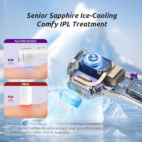 - NAISIGOO Dual-Stage Intelligent Cooling System: Our IPL hair removal device uses a cutting-edge dual-stage fan intelligent cooling system to ensure constant temperature during long-term use, safe and stable as ever. The ultimate cooling technology allows multi-zone treatments to be smooth and efficient, and done in one go. No need to wait, it's done in an instant. Every use is a pleasant journey of luxurious care, and your skin will bloom with silky luster in the gentleness, glowing with unprecedented softness and smoothness