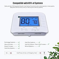 Our Non-Programmable Thermostat 2 heat/ 2 cool multi-stage systems is designed for easy installation and operation. (Kind reminder: Before purchasing, please check if this thermostat is compatible with your old thermostat) Large Numbers Display: The thermostat features a large display with clear and easy-to-read numbers, making it convenient for anyone to check the temperature and humidity levels at a glance. DOES NOT WORK with Heat Pump Systems, Does Not Work Aux heating and Emergency heating, Does Not Work RV, Does Not Work 120/240V Electric Baseboard / Line Volt Systems. Versatile Compatibility: Compatible with Central gas, oil, or electric furnace systems, our thermostat can efficiently control the heating and cooling of your home, providing maximum comfort. Power Options: This thermostat can be powered either by a 24VAC power source or 2 AAA batteries (C-wire is not required), giving you flexibility in choosing the power supply that suits your needs. Temperature Calibration: Our thermostat allows for temperature calibration, ensuring accurate and precise temperature control, so you can enjoy the perfect indoor climate. Compressor Delay Protection: Equipped with compressor delay protection, our thermostat prevents frequent cycling of the compressor, extending its lifespan and saving energy. Heating and Cooling Swing: The heating and cooling swing feature of our thermostat allows for better temperature control, ensuring optimal comfort in your home. with 2-year warranty.