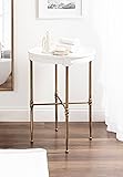 - Introducing the Kate and Laurel Valdi round side table, a captivating blend of glam and modern elegance. Crafted with meticulous attention to detail, the Valdi side table features a sturdy geometric metal base that exudes timeless charm. Its intricate design adds a touch of artistic flair, while providing excellent stability and durability. The antique gold finish complements the satin white tabletop, creating a striking contrast that enhances its visual appeal. The protective rounded tabletop of the Valdi offers a convenient spot to place drinks, books, or decorative items. Its circular shape adds a sense of harmony and balance to the overall design, making it a perfect choice for smaller spaces or as an accent table in larger rooms. Versatile and practical, this round side table effortlessly blends with a variety of decor styles and can be assembled in just one quick and easy step. Whether you prefer a vintage-inspired setting, a contemporary look, or a fusion of both, the Valdi side table seamlessly complements your unique aesthetic. Measuring 18.25 inches in diameter by 26 inches tall, this exquisite piece showcases a sophisticated color palette of white and antique gold, making it a stylish addition to any living space.