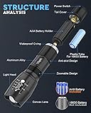 [ SUPER BRIGHT ] Illuminate your path with this flash light boasting high lumens of brightness, capable of reaching up to 656 feet. With a remarkable lifespan of over 50,000 hours, this flashlights high lumens will light your way through any adventure. Designed to withstand extreme weather conditions such as rain, sun, and freezing temperatures, it's an essential outdoor tool. [ 5 MODES & ZOOMABLE ] Choose from five different modes of our led flashlight including low, medium, high, SOS, and strobe. Whether you're camping, hunting, hiking, biking, or experiencing a power outage, these modes have got you covered. The adjustable focus allows you to switch between a spot and flood beam, providing you with a clear view of your surroundings. [ AIRCRAFT-GRADE MATERIAL ] This tactical flashlight is crafted from premium aircraft-grade alloy with a type 3 hard-anodized anti-abrasive coating, ensuring its durability, waterproof, dustproof, and wear-resistant properties. The ultra-dense fine-grained non-slip design offers a comfortable grip for a better user experience. [ BATTERY & CASE INCLUDED ] Unlike other flashlights, we provide 6 AAA batteries for immediate use upon receiving this flashlights for emergencies. Additionally, we include a battery tube for rechargeable battery. This two-in-one design gives you more options and convenience. [ PERFECT GIFT CHOICE ] Struggling to find the right gift? Look no further. Surprise your loved ones with this bright flashlight for Valentine's Day, Father's Day, Halloween, Thanksgiving, or Christmas. It's the ultimate gift for men, dad, parents, boyfriends, sons, neighbors, or anyone who loves the great outdoors. Get yours now and light up their world!