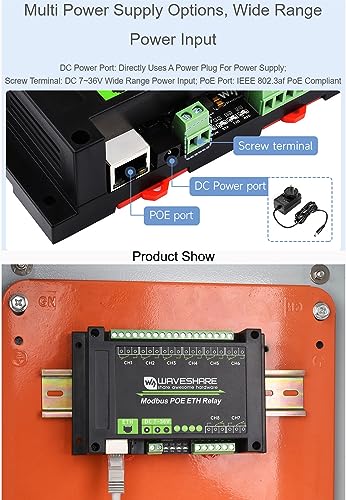 Overview This product is an industrial 8-ch relay module controlled via Ethernet port, adopts Modbus RTU/Modbus TCP protocols, supports PoE power supply, also comes with an ABS rail-mount case. Features 1. Supports sending Modbus RTU/TCP protocol commands via Ethernet port to control relay and various devices 2. Supports Multiple Communication Modes, Adopts Modbus Protocol --Supports TCP Server / TCP Client / UDP Mode / UDP Multicast / HTTP / MQTT --Supports Modbus RTU protocol/Modbus TCP protocol 3. Multi Configuration Methods Supports software and Web Browser Configuration, Obtaining Dynamic IP Via DHCP, connecting to domain name server via DNS protocol 4. Multi Power Supply Options, Wide Range Power Input --DC Power port: directly uses a power plug for power supply; --Screw terminal: DC 7~36V wide range power input; PoE port: IEEE 802.3af PoE compliant 5. Relay Connection --Contact Rating Of The Onboard Relay Up To 10A 250VAC/30VDC --Directly Controlling 220VAC Home Appliances, Or Devices Below 30VDC 6. 4 LEDs and Network indicators for indicating the MCU status and signal transceiving status --RUN: Ethernet port indicator, blinking in 2-second cycles when Ethernet port normally working --STA: MCU indicator, blinking when the MCU normally working --TXD: TX indicator, lights up when sending data --RXD: RX indicator, lights up when receiving data 7. Application Scenarios --Control the on/off operation of household devices such as air conditioners, routers, lighting, computers, and door curtain motors, etc. --Control the on/off operation of agricultural equipments such as solenoid valves, motors, water pumps, etc. How-to-use document/User Manual ://bit.ly/45dleiL Package Content Modbus POE ETH Relay x1