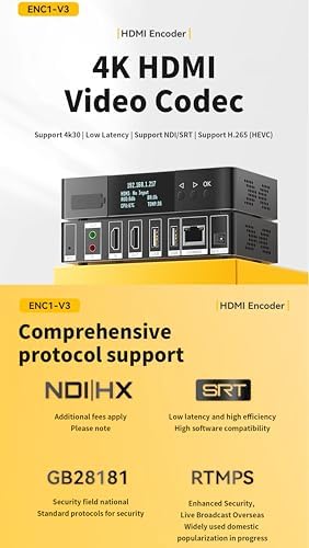 - [Multi-protocol Transmission] ENC1-V3 HD encoder with HDMI 1.4 support up to 4K@30fps 1080p@60fps input and multi protocol live broadcasting, including SRT/RTSP/RTMP/RTMPS/HTTP/HLS/UDP/ONVIF/Unitcast/Multicasting, by enabling the SRT protocol, users can connect any channel of the encoder to OBS, vMix and other software for secondary editing and publishing.
