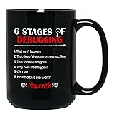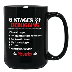 - 6 Stages Of Debugging Ceramic Mug Gift For Programmer Programming Coding Code IT Tech Support, Personalized Programmer Black Coffee Mug 11 15 Oz, 6 Stages Of Debugging Mug With Custom Programmer Name ☛ If you are still looking for an awesome and novelty gift. This personalized 6 Stages Of Debugging coffee mug is an ideal gift to your loved ones. CUSTOMIZATION is a great way to put your mark on a present when you hand out someone. Whenever they use this awesome personalized travel ceramic coffee mug cup gift, they will think of you.✔ SIZE & FEATURES: Black ceramic mug features solid cup bottom, thick cup wall, anti-slip design and C-shaped handle for an easy, comfortable grip. This awesome mug comes in two sizes: 11 Oz. which is the standard coffee mug size and 15 Oz. which is good if you like a bigger cup with more. Perfect size for using daily at home or office.✔ HIGH QUALITY COFFE CUP: High quality coffee mug cup with the design professionally printed on both sides of the mug so that everyone can see the unique graphic whether you are right or left-handed. We employ the latest in print technology, the design will not peel off or fade away.Our ceramic mugs can be used in a microwave to heat up beverages, and can be cleaned in a dishwasher or by hand.✔ BEST MUG GIFT EVER: This awesome coffee mug is perfect for Father's Day Gift, Mother's Day Gift, Christmas Gift, Birthday Gift, Graduation Gift, Retirement Gift. Thoughtful gift for Programmer, Computer Programmer, Coder, Code Programmer, Programming Students, Code Lover, Web Development, Software Developer, Software Engineer.☛ If you have any query about your purchase or anything, please contact us. Making you satisfied is our priority.