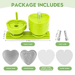 - COMPLETE FULL PACKAGE: Heart Shaped Button Maker Molds Replacement Kits Contains: 1 X Heart Shaped Pins Press Button Mold ,10 X Blank Button Refills ,10 X Mylar Sheets,2X Mini Nails