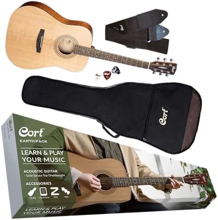 The Cort Earth Pack delivers a bold playing experience for any aspiring players seeking quality built instrument in a complete starter package. The Earth Pack includes Earth60 with features that are hard to find in its price range. Earth60 features a full-sized dreadnought body with solid spruce top and mahogany back and sides for great top end tone and warm, balanced sounds, and is built by the same builders that make Corts higher tier models. Also included in the Earth Pack are a spare pack of strings, picks, a gig bag and an electronic guitar tuner to get you playing instantly.