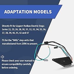 【OEM STANDARD】This RV electric step control unit is manufactured in accordance with OE specifications. Meet or exceed OEM standards and can be directly installed. The step control unit automatically extends and retracts steps when the RV door is opened and shut (Replace# 909510000 9510 LC379146). 【COMPATIBLE MODELS】Directly fit for Lippert Kwikee Electric Steps Series 22, 23, 26, 28, 30, 31, 32, 33, 34, 35, 36, 37, 38, 39, 40, 41, 42 and 47. Replaced on the "IMGL" step units that manufactured from 2006 to present. (Please check your model and part number carefully before ordering to ensure compatibility). 【UPGRADED QUALITY】This RV stair entry step control unit can provide excellent performance and long service life. All cables and original connectors can be perfectly fitted to ensure safe and stable installation and control. Replace the old electric step control and enjoy your travel time! 【EASY TO INSTALL】Our RV step controller is the same size as the original parts (909510000). You can directly replace it yourself and finish it in 10 minutes! It saves you the time of changing back and forth, and also helps you save money. (Tips: The detailed replacement steps are in the description.) 【100% SATISFACTION SERVICE】If you have any questions or dissatisfaction, please email us and we will help you solve it perfectly - 36 Months Warranty & 24 Hours Service.