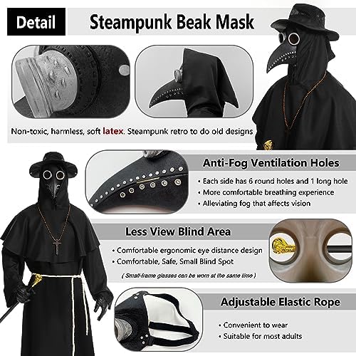 - [Abundant Accessories Allow Creative Combinations] - Put on our steampunk mask and other accessories, the Halloween plague doctor look is perfect for creeping your friends out at Halloween parties! Take off the long nose beak mask, you can also cos Grim Reaper, Wizard, or Medieval Priest.