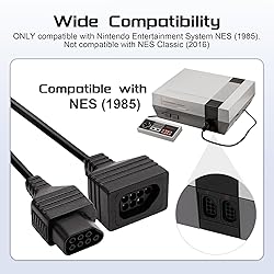 - Product Features: Power-up your Gaming Our NES controller power cord is the best way to power-up your gaming controller. This 6ft long extension cable allows you to charge your controllers while still enjoying your favorite games simultaneously. Longer Than Your Imagination The two power cables are 1.8M/6ft length, which provides the freedom that you can sit back and enjoy playing at comfortable distance. For more joy, you can also connect the two cables to one 3.6M/12FT length to play. Wherever is comfortable, wherever you can stay. Durable, Sturdy Quality The replacement extension cable is made of a high-quality PVC jacket, which is durable. High-quality copper wire and shield inside for optimal signal, so that you will no lag during the game. Widely Compatible: ONLY compatible with Nintendo Entertainment System NES (1985). NOT compatible with NES Classic (2016). Product Specifications: Color: Black Material: Metal+Plastic. Cable Length: 1.8M/6FT Plug Type: 7 Pin for NES Package Contents: 2 x Extension Cable Promise: We offer 18-month quality assurance for all products, providing lifelong technical support, with no worry about using it.