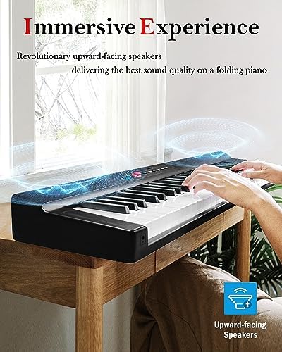 - [Best Sound Quality on a Folding Piano] Elevate your auditory experience with our newly upgraded folding piano FOLD PRO II, featuring revolutionary upward-facing speakers. This marks the first application of such speakers on folding pianos. Equipped with dual 10W speakers, it delivers powerful and immersive sound. The innovative design directs sound upward, creating a natural and immersive audio journey.