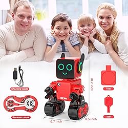 - OKK robot toys are committed not solely about toys but to also provide development skills for your child while still having fun. The R4 robot for kids is ready for your commands. It will sing, dance and move to your command!Touch interaction mode: Touch the top of the toy robot head to start a new command that’s program in the system! Hand clapping interaction mode: Clap your hands, the interactive toys will perform the corresponding action, interact with children and engage their interest.Singing and dancing mode: The little smart dancing robot will sing and dance, turn on the eye and ear lights, rich and brilliant colors immediately rendered the atmosphere, makes kids want to join in the fun.Remote control robot: This rc robot can be controlled by a remote control and move back and forth, left and right, adjust the volume. The programmable robot is also an assistant, with a detachable tray, transport gifts, blocks, etc. Multi-functions set in one!This interactive robot can record what you say and repeat it with other voices, so play around with the speaker and listen to it in different voices.This educational toy head features a small hidden coin savings jar, through the attached key to open the jar, no longer need to smash the traditional savings jar to extract the coins inside, can effectively exercise children's savings skills. It is a best birthday gift, holiday gifts, Christmas gifts for kids of all ages!Material: PlasticBattery: 3.7V, 400mAh lithium battery (Included)Charging: USB chargingCharging duration: About 60 minutesPlaying time: About 70 minutesRemote control battery: 2 x AAA batteries (Not included)Package Include:1x Intelligent Robot Toy1x Remote Control1x USB Charging Cable1x Tray and Key1x User Manual