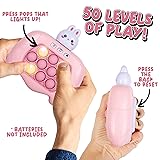 A RECIPE FOR GLEE: Keep your little one occupied for hours at home or away. With a pop-it style interface, melodic music, lights, and engaging modes, this quick-push game for kids keeps boredom at bay. 4 IMMERSIVE MODES: Sharpen minds while sparking smiles. The different modes with varying difficulty help with hand-eye coordination, memory, and reaction time. They start out easy, making them great for young ones as well. MUSIC MEETS LIGHT: Kids will love the LED and sound effects that add an extra layer to the fun. You’ll have the power to turn off the sound and music for some quiet playtime. Requires 3 x AAA batteries (not included). OH, SO ADORABLE: This pop-it toy for kids comes with a bunny head that can be attached to the top for adorable gaming. The video game controller style makes this a great travel toy for kids to keep them occupied on the road. FUN GIFT IDEA: Looking for Easter toys for kids? A birthday present any boy or girl will love? A holiday gift that will leave smiles in its wake? You’ve found it! Ideal for ages 3 and up.