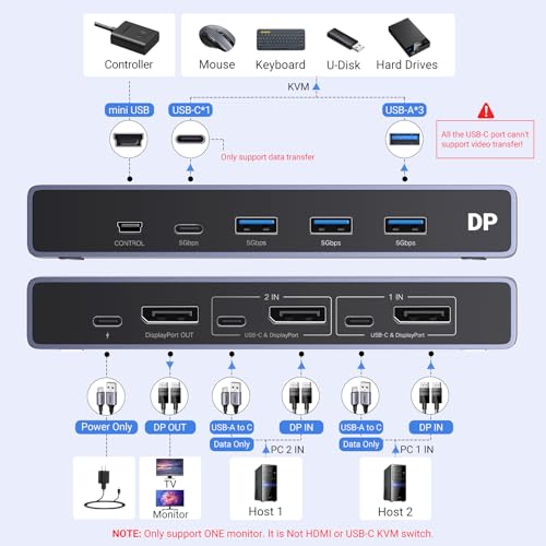 - Displayport KVM Switch 1 Monitor 2 Computers: This DP KVM switch allows 2 computers to share a monitor and 4 USB 3.0 devices such as a set keyboard, mouse, hard drives, U disk and printer, it's not only a DisplayPort Switch, but also is a keyboard mouse switch. You can easily switch between two hosts, which helps to maximize productivity. NOTE: Must Connect two USB A to C cables for the Power Supply and data transfer. It is NOT a USB-C KVM Switch