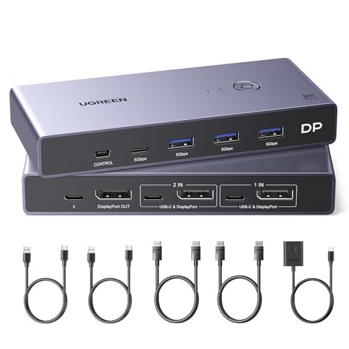 UGREEN 8K Displayport KVM Switch 2 in 1 Out DP1.4 with 4 USB 3.0 Ports(3 USB-A + 1 USB-C) Support 8K@60Hz 4K@240Hz Share 1 Monitor Keyboard Mouse U-Disk Printer, with 2 DP Cables, 2 USB A to C Cables