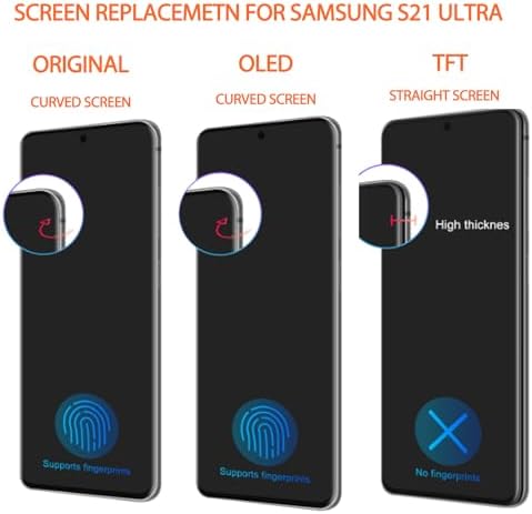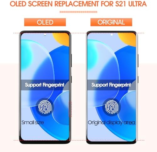- 【OLED screen 】This Samsung S21 Ultra 5G screen replacement belongs to OLED screenSame as original screen with fingerprint.This OLED screen is made of glass and is thinner than INCELL screen(INCELL screen is made of iron sheet and is heavier),This OLED screen display is better than INCELL screen,The OLED screen quality is better than INCELL screen. The OLED screen quality is close to the original screen, so it is recommended to buy OLED screen.