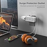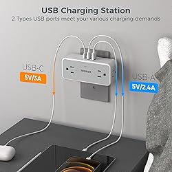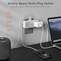 Multiple Plug Outlet: This wall plug extender could turn 1 socket into 4 AC outlets and 3 USB ports, accept the standard N American 2 or 3 prong flat pin plug, can charge 7 devices simultaneously; You can use it in any indoor place such as home, office and dorm room. Wide-space Outlet: Integrated opposite direction 2.2-in long space outlet in center panel, 3-side design AC outlets can fit large plugs at the same time without blocking; Compact enough to occupy only a single socket on your wall; Fit for both GFCI and standard receptacles. Ideal USB C Wall Charger: Dual USB A ports features 2.4A (12W), the USB C port features 3A (15W); 2 types of USB ports can detect charged devices and deliver optimal charging speed, giving you more charging options; idea for USB devices like cell phone, tablet, earphone, etc. Surge Protector Outlet: The power of wall outlet expander ranges 1875W max, 900 Joules wall outlet surge protector protect your expensive computers, hairdryers, shavers, and other devices from surges and spikes disturbances, provide a safe and reliable charging environment. Space Saving: Plug this multiple plug outlet on the top of outlet without blocking the other below, and create a multiple port charging station in your bedroom, kitchen, living room or any area with limited outlets.