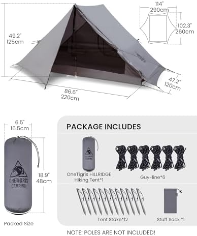 Why Choose OneTigris HILLRIDGE Backpacking Tent?The HILLRIDGE is a sleek design that’s perfect for trekkers and backpackers who need lightweight gear that is quick to set up.Featuring 3000mm waterproof rating and space capacity of 2 campers, it’s highly ideal for that weekend getaway you need to unwind in nature.The tent has an upgraded ventilation system for better airflow to prevent condensation and leaks, and there’s a mosquito net and camp light attachment points for those midnight snacking sessions to light the way to happy munchies.It’s a beautiful piece of kit for outdoors lovers looking for something light, simple and budget friendly, and is a great option for beginners as well thanks to its easy setup design.Get the HILLRIDGE and set your soul free.SpecificationsMaterial: 20D Sil-Coated Nylon, YKK Zippers, YNS ClipsDimensions: 13.8ft (L) *7ft (W) *4.26ft (D)Sleeping Area: 86.6" * 47.2"/ 220cm *120cmSpace Capacity: 1 - 2 CampersPacked: 18.9" (L) *6.5" (W)/ 48cm *16.5cmProduct Weight: 1370g (3Ibs)Waterproof Rating: 3000mmColor: Wolf GrayNote1. Set up on even ground and remove twigs and other sharp objects to prevent damage to the fabric2. For longer shelf life, air out to dry after use in the rain and store the product in a cool dry space3. Always take caution when starting fires in the outdoors to keep yourself and the campsite safe from fire hazards4. This product does NOT come with tent polesPackage IncludesOneTigris HILLRIDGE Backpacking Tent *1Guy-line *6Tent Stake *12Stuff Sack *2