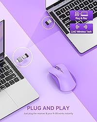 💕COMFORTABLE & ERGONOMIC DESIGN - Our RAPIQUE Wireless Mouse is designed with your comfort in mind. Its compact and ergonomic shape fits comfortably in your palm, reducing fatigue even after long hours of use. The sweat-resistant coating adds an extra level of comfort to enhance your overall experience. 💕PRECISE & EFFORTLESS CONTROL - This silent mouse features a three-setting DPI switch and 6 BUTTONS for easy control. With adjustable DPI levels of 800, 1200, and 1600, you can customize your cursor speed to suit your needs. The precision tracking works on various surfaces, and the DPI button allows you to change sensitivity on the go. The additional 2 side buttons (Forward and back) are perfect for work and gaming purposes. 💕EASY TO USE & CONVENIENT - Our noiseless wireless mouse is plug-and-play, requiring no additional drivers. The nano-receiver can be conveniently stored inside the mouse or left in your PC USB port. It only requires 1 AA battery (not included) to operate. 💕STABLE & RELIABLE CONNECTION - With a 2.4 GHz wireless connection, this mouse offers a powerful and stable connection up to 33 feet. The intelligent power-saving design ensures longer battery life, automatically entering power-saving or sleep mode after periods of inactivity. The mouse is also durability tested with over 5,000,000 keystrokes. 💕WIDE COMPATIBILITY - Our wireless mouse is compatible with various operating systems including Windows 2000/ME/XP/7/8/10, Vista, and Mac OS. It can be used with laptops, PCs, notebooks, Surface Pros, Chromebooks, or MacBooks. Please note that the side buttons are not available for Mac OS, but all other functions work normally. The USB receiver is conveniently stored under the back of the mouse. Please Note: If your laptop only has a Type-C port, you will need to connect the supplied USB-C adapter to use the mouse. This stylish and elegant purple wireless mouse is suitable for work, travel, and gaming. It also makes for a thoughtful gift for family, friends, kids, classmates, or colleagues. If you have any questions or issues, please don't hesitate to contact us. We are committed to providing you with an excellent shopping experience.