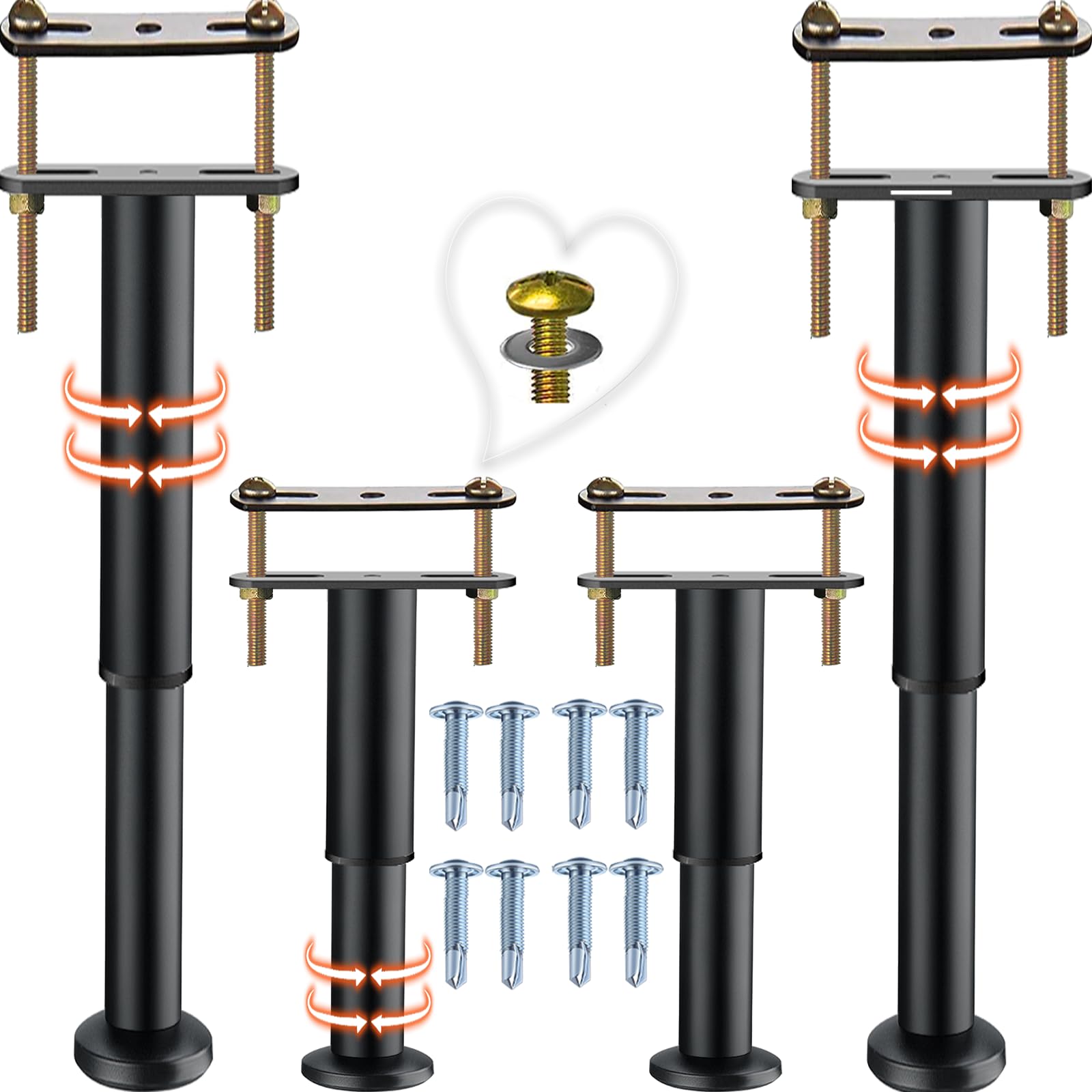 【INSTALLATION SIMPLIFIED】Easily install with just a screwdriver or handheld drill.Our kit includes can drill directly through the iron bed beam self-drilling screwsfor iron beams and clamp plates for wooden frames. Compatible with all bed types: platform beds, slatted bases, metal/wooden frames. 【HEIGHT ADJUSTMENT】(10-17 inches) Fix uneven beds in seconds using the swivel base. Pro Tip: For optimal stability, maintain 1" below maximum height. Perfect for older homes with sloping floors or thick carpet transitions also. 【ANTI-SAG TECHNOLOGY】Prevent mattress-induced sag | bending with 700lb capacity support (tested to 852lbs). Specifically designed for: 1.Heavy hybrid | memory foam mattresses. | 2.King/California King bed frames. | 3.Platform beds without center beams.Save you 500$ on bed replacement. 【INDUSTRIAL-GRADE CONSTRUCTION 】Steel core with anti-slip rubber base protects floors from: Scratches (60D rubber hardness) | Water damage (IPX4-rated seals) | Noise | shock-absorbing design 【MULTI-PURPOSE SUPPORT 】Beyond bed frames, stabilize: 【Furniture】Wobbling bookshelves | entertainment centers 【Storage】Overloaded dressers | armoires 【Seating】Recliners | ottomans with uneven legs 【COMPLETE KIT INCLUDES 】2x Adjustable legs(10"-17")| 2x Mount plates| 4x Long screws| 4x Self-tapping metal screws| 4x washers. 【PROFESSIONAL RECOMMENDATIONS】Measure required height between floor and bed rail. (PlLEASE CHECK required length before you buy to make sure the size is exactly what you need.)