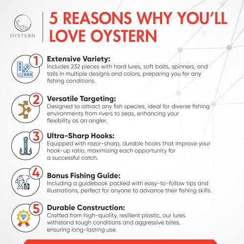 - 🐟 Huge Range of Lures – Our premium fishing kit includes 232 assorted lures: 5 hard lures, 6 metal spoons, 69 soft baits, 51 tails, and 2 spinners. Changing lure types and colors often is essential for maximizing catches, especially in varying weather.