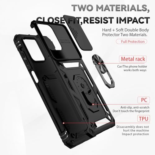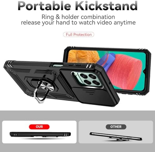 Compatibility: Compatible with Samsung Galaxy M33 5G 6.6" SM-M336B SM-M336BU SM-M336K. Please choose the right phone case before you buy it or you can ask me question in "Have a question". 【Materal】: Dual-layer design (Hard PC and Soft TPU ) and 1 mm raised lip of four corners,which is effectively protect the screen and camera.Built-in metal magnetic sheet can be directly stably attached to a magnetic car mount .(NOT including car mount) 【Heavy duty protection】:Heavy duty protection keeps your phone safe from drops and shocks. Impact resistant high quality TPU provide superior phone protection and control. 【Ring holder & KickStand】: Built-in Kickstand 360° rotating ring holder is perfectly situated at an angle ,that allows you make hands-free video calls, read, and watch movies comfortably. 【Camera Protection Design】:Slide Camera Cover to protect the camera from scratching, 2.0 mm lifted bezel for camera protection. Compatible with: 1 x Cover Cases Samsung Galaxy M33 5G 1 x HD Tempered Glass Screen Protectors