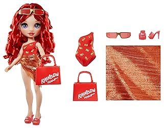Muñeca de moda Rainbow High Swim & Style Ruby, Rojo 11" con envoltura brillante para estilizar 10+ formas, traje de baño removible, sandalias, divertidos accesorios de juego. Juguete para niños regalo de 4 a 12 años