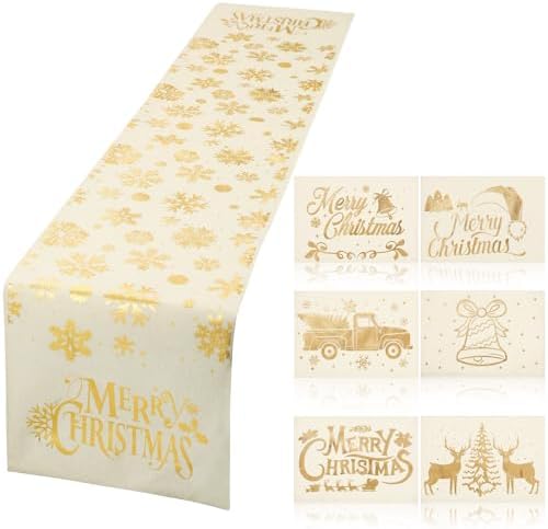 Features: The dinning table decor makes for a warm and thoughtful gift for your loved ones. It's a sweet present for home, adding a festive touch and demonstrating attentiveness to detail. It shows your effort in finding a gift mirroring both beauty and functionality. This dining table mats set of 6 with runner serves as festive decors, evoking the Christmas spirit with its mixed white gold color and delicate design. It is versatile and can be served for family dinners, holiday parties. Specifications: Material: linenColor: mixed white goldSize: Table runner: about 70.87 x 12.99 inches/ 180 x 33 cmPlacemat: about 17.72 x 11.81 inches/ 45 x 30 cmPackage includes: 1 x Table runner 6 x Placemats Notes: Manual measurement, please allow slight errors on size. The color may exist a slight difference due to different screen displays. Words printed on our products are only for decorating, not as trademarks, and our trademark is VitalCozy.